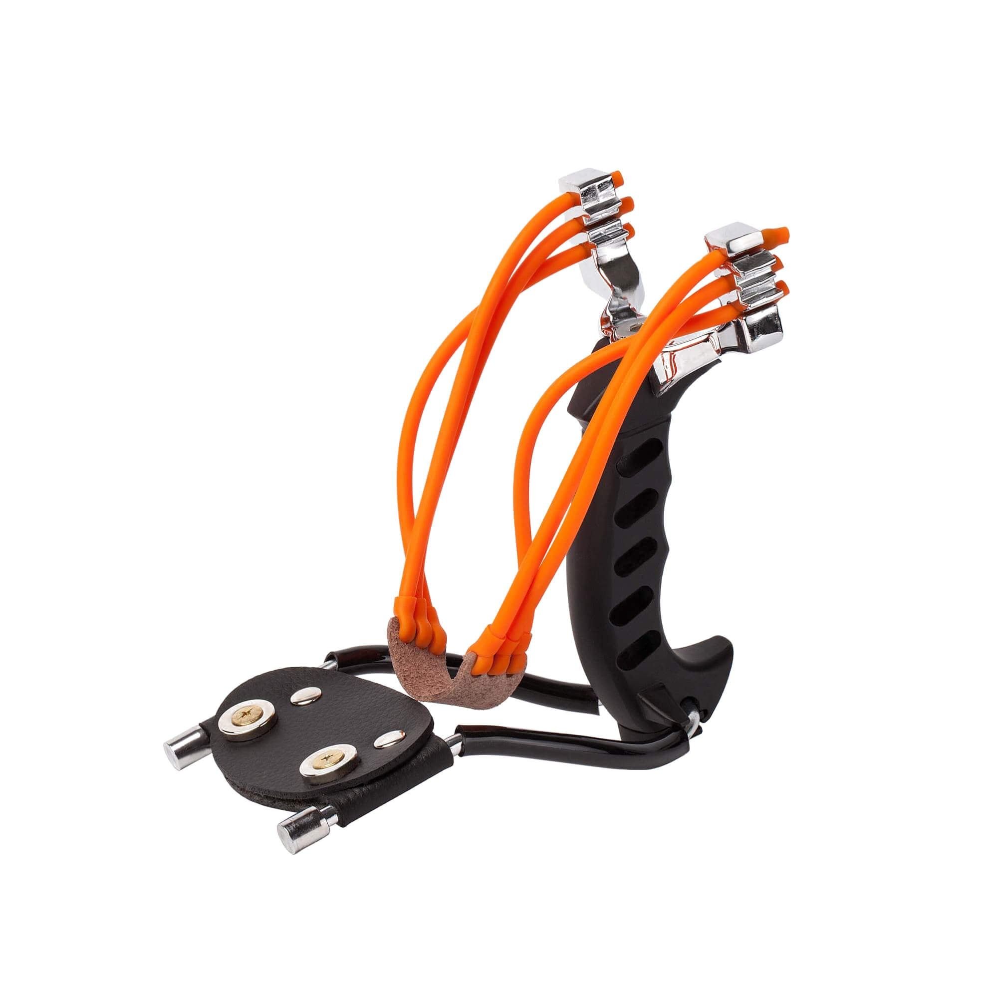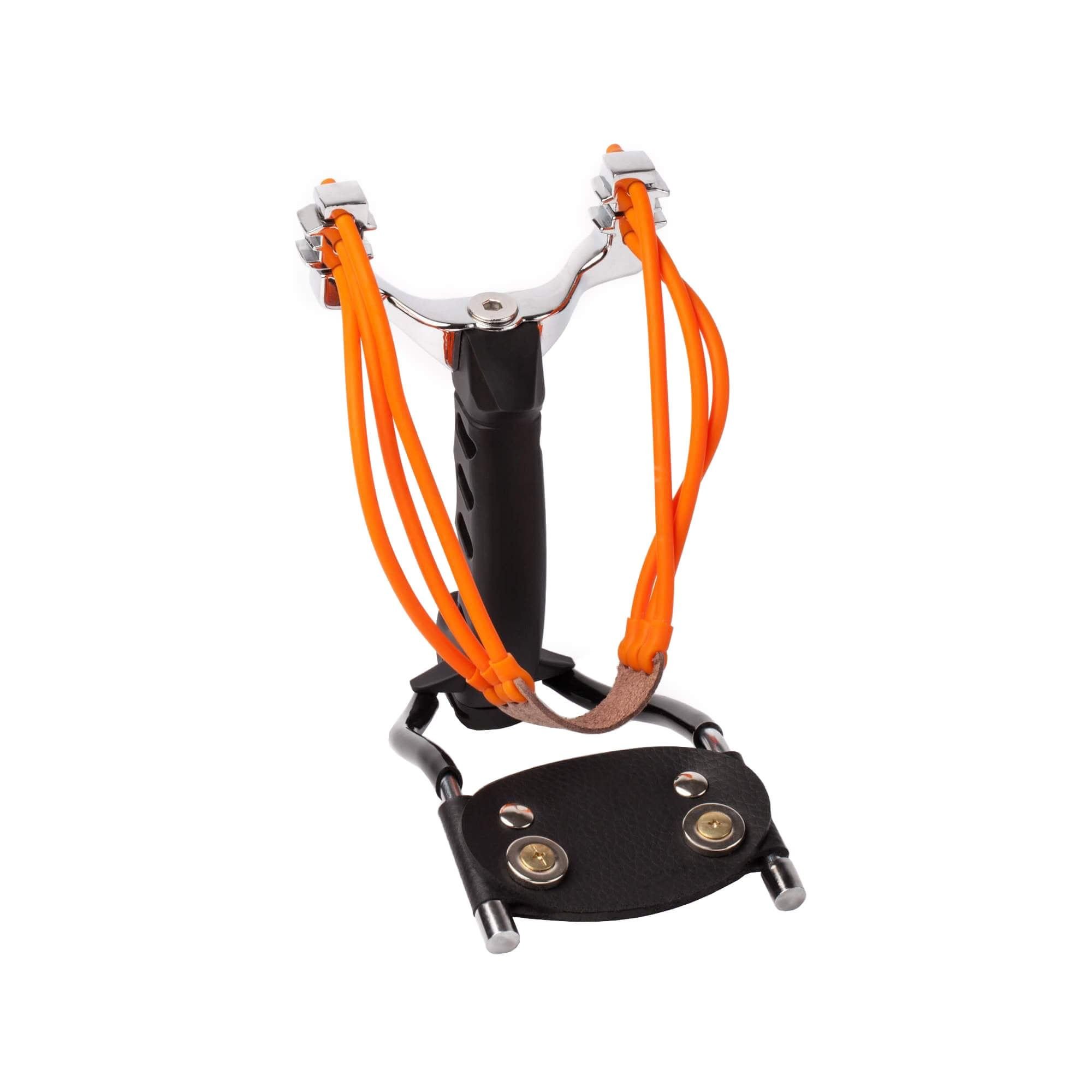 The Ballista 02 is one of the original tactical slings produced by Mavik. The Ballista 02 features a light plastic handle and finger ridges for easy and simple handling. The leather wrist rest acts as a magnet for ammo balls.