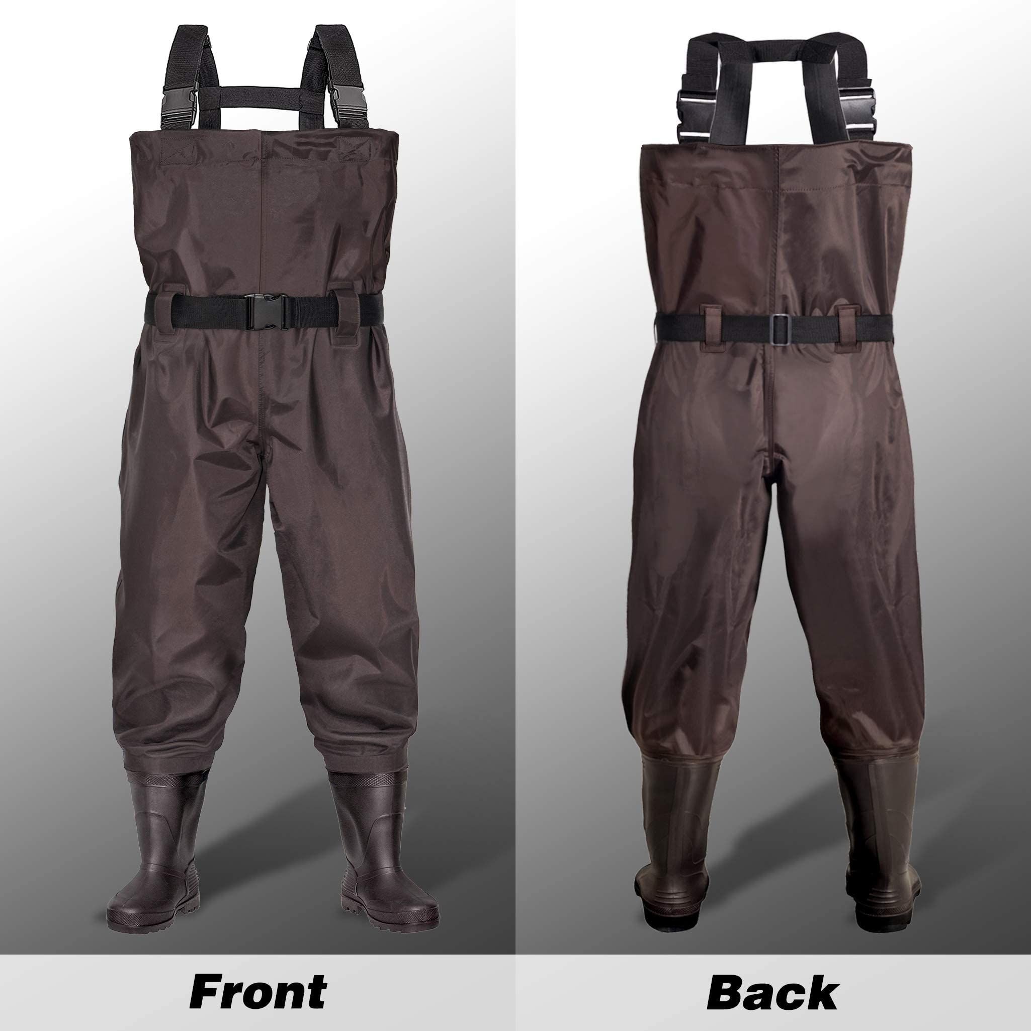 1.Color&Size: BELLE DURA Fishing waders have brown color and green, Both colors are perfect for men, women, youth, kids, boys and girls.PVC Boots with a standard size , waders with boots size 5 , Size 6, Size 7, Size 8, Size 9, Size 10, Size 11, Size 12, Size 13, Please choose your usual shoe size.If you have wide feet or need to wear thick socks, choose a size larger than usual.