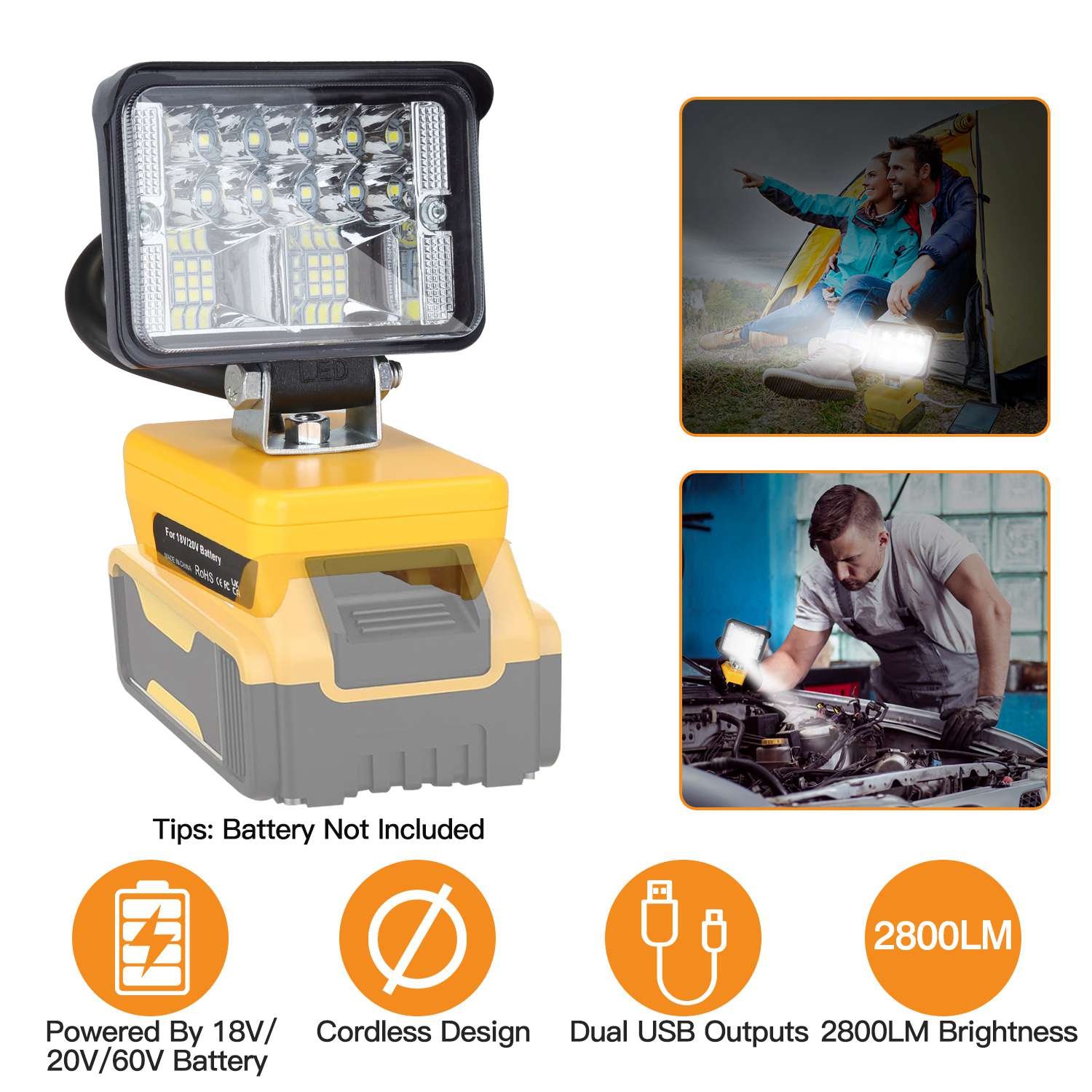 Home > Cordless LED Work Light LED Flood Light for Dewalt 18V 20V 60V Battery 12W 2800LM with Dual USB Charging Port for Workshop Camping Outdoor Emergencies