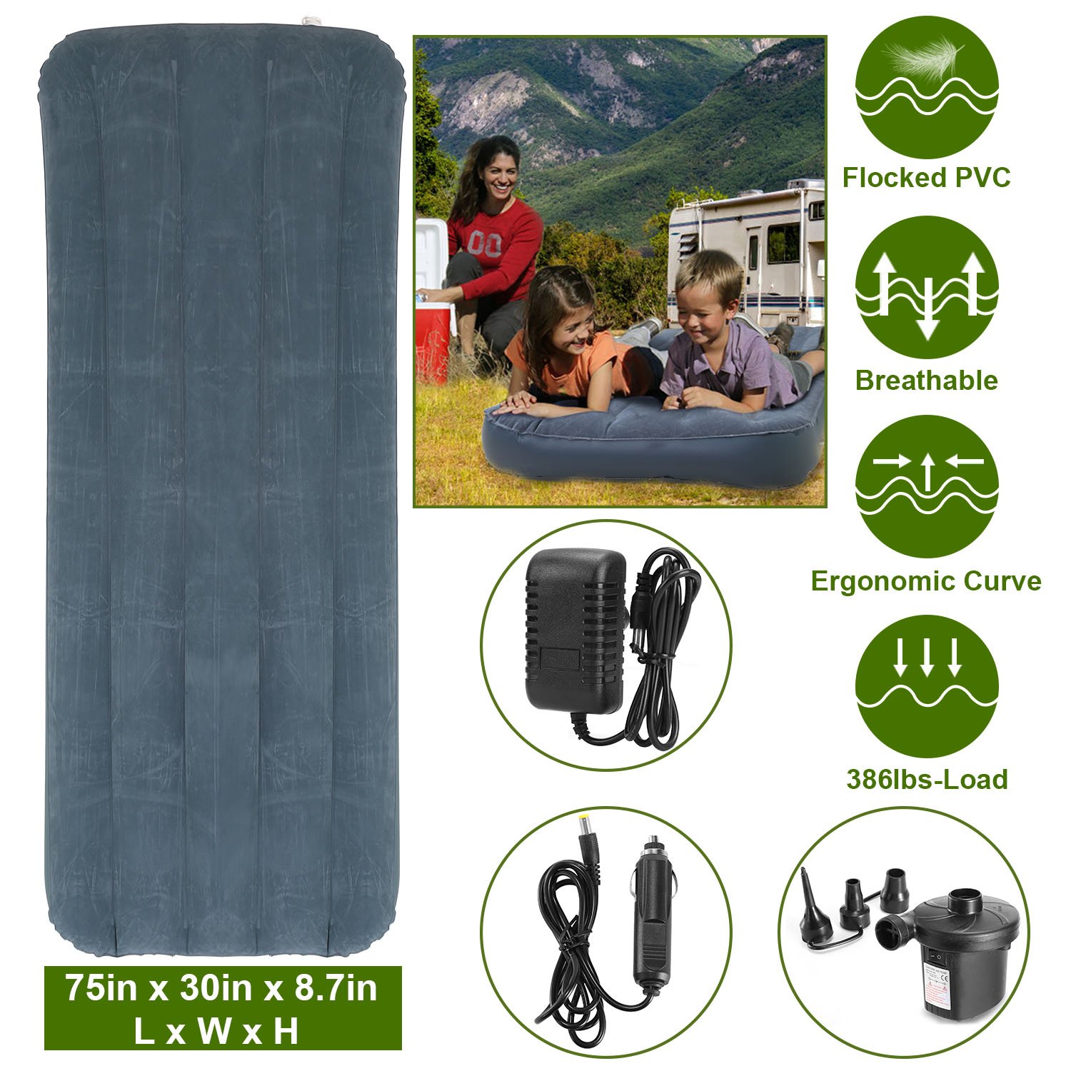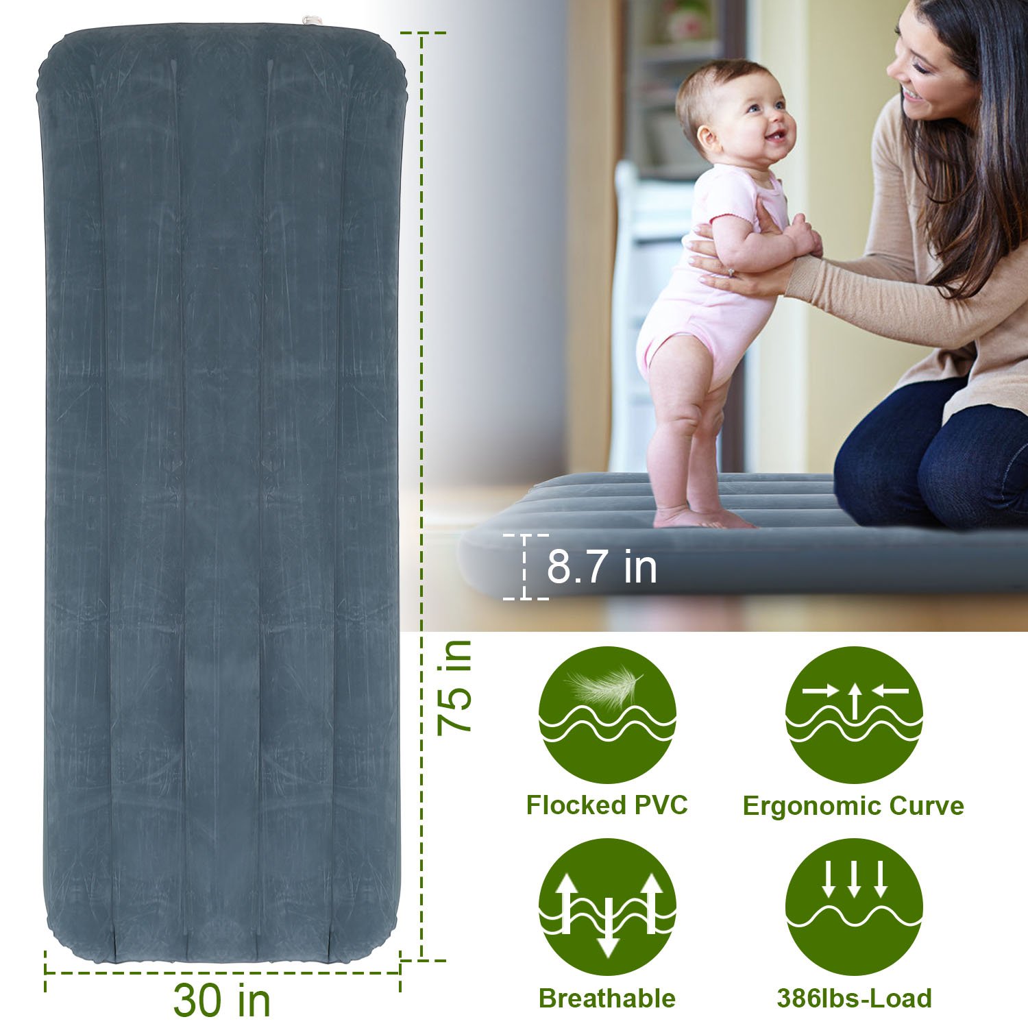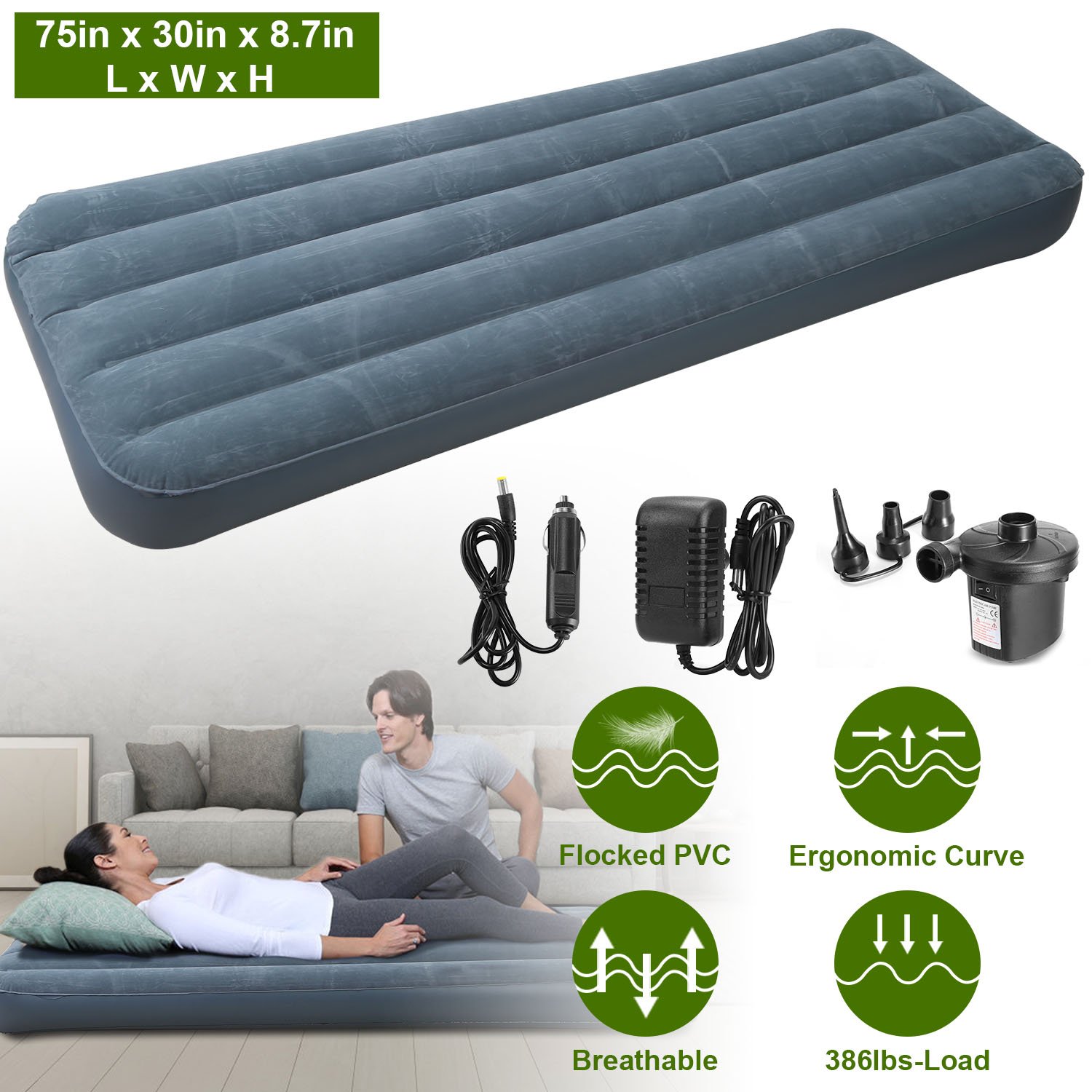 Our single inflatable air mattress (75inches-L x 30inches-W x 8.7inches-H) integrates with high-grade 0.014inches-thickness PVC materials and 0.022inches-thickness flocked surface, water-resistant, moisture-proof, abrasion-resistant, skin-friendly and sleeping comfortably. And adopting coil-beam internal structure, it is durable and stable and can support items up to 386lbs. Additionally, it designs a 2-in-1 valve for quick inflation and deflation and comes an electric pump which can be charged by included power adapter and car charger for an easy inflation.