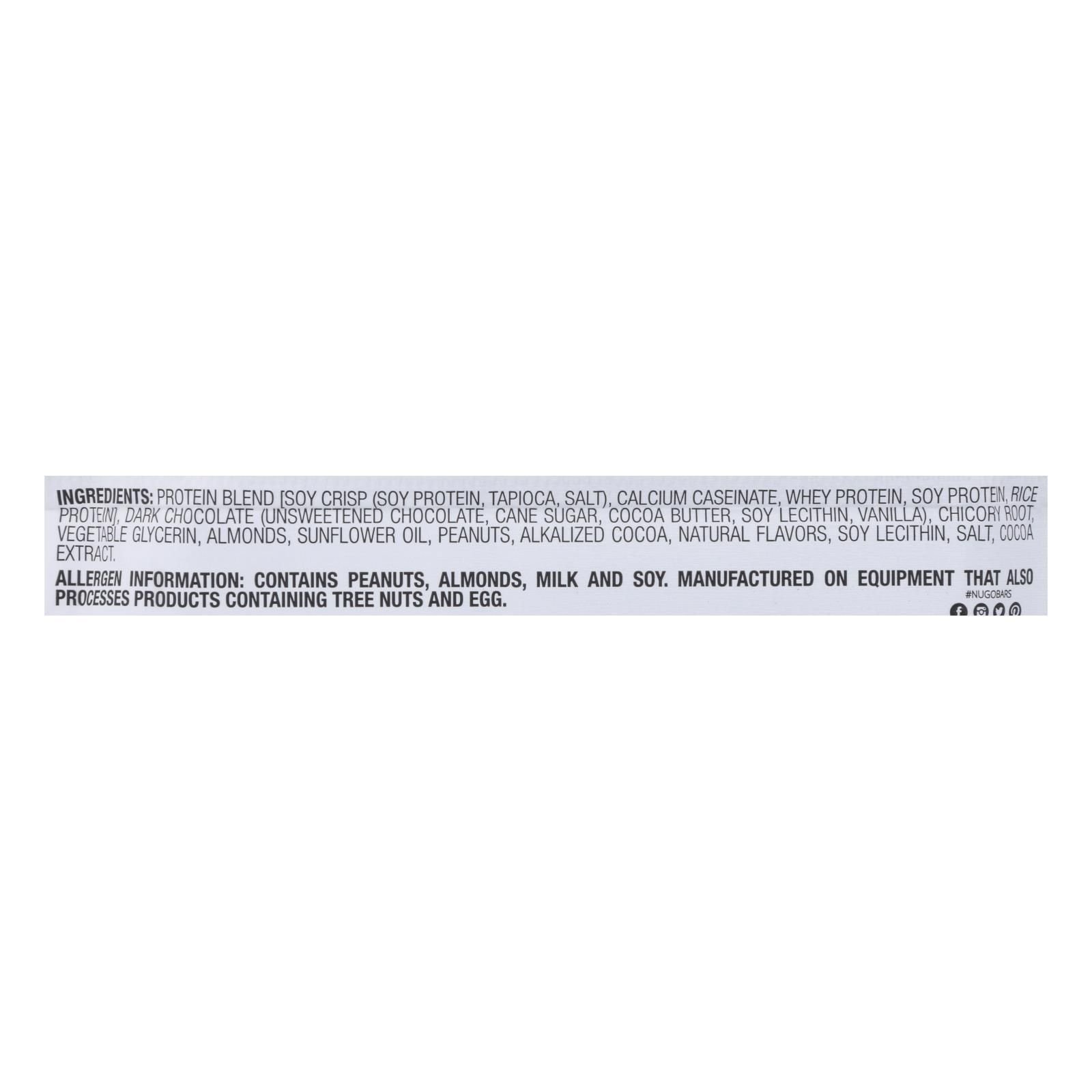 Nugo slim protein bar, brownie crunch is nutrition to-go. This product contains 16 g. Protein, 2 g. Sugar, and 7 g. Fiber per bar. Nugo slim protein bar, brownie crunch is dipped in real dark chocolate and comes packaged for your convenience and easy disposal. This product is non-gmo, gluten-free and does not contain maltitol.
