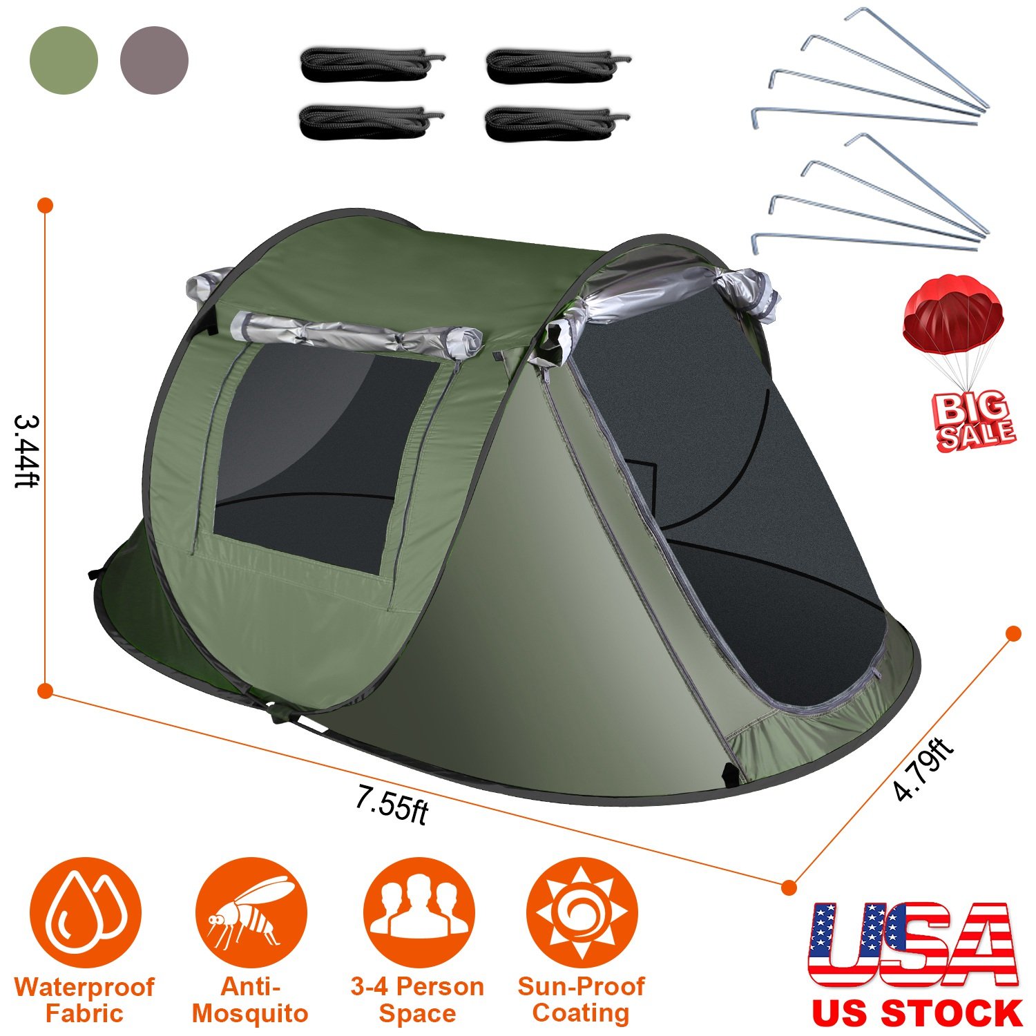 Our camping tent with unfolded size of 7.55x4.79x3.44ft, can hold up to 4 people, great for taking for travel with your families or friends. Designed with 2 symmetrical windows and doors with net and curtain, can effectively prevent mosquito and ensure excellent air circulation. Easy to set up by taking it out. It will auto open within 1 second. Designed with dual pockets inside for holding snacks or toys, while hook on the top for hanging a light conveniently at night for illumination. Come with a carrying bag for quick storage and easy travel. Perfect for camping, hiking, climbing, etc..