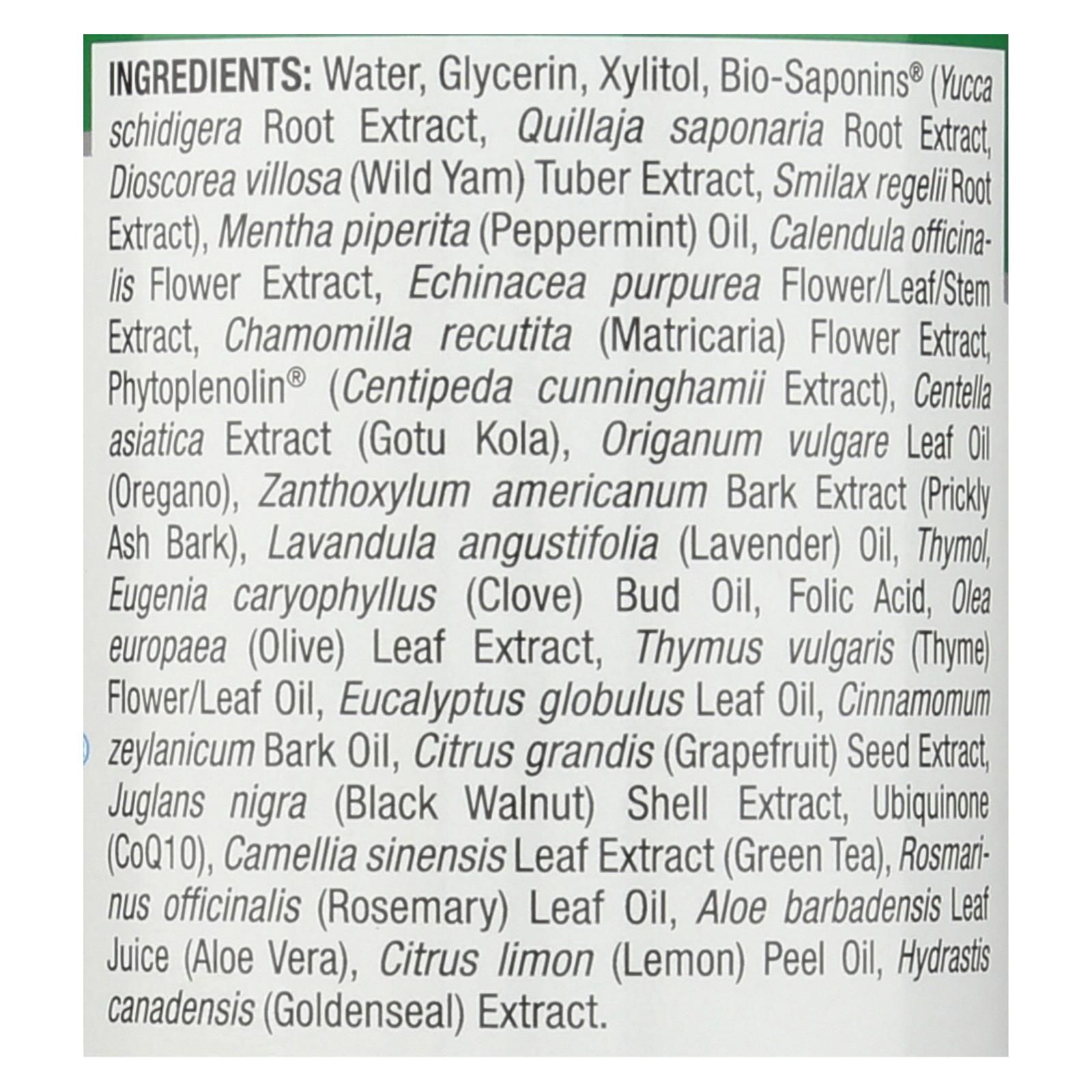 ingredients : water;glycerin;xylitol;bio-saponins®;yucca schidigera root extract;quillaja saponaria root extract;dioscorea viillosa;wild yam;tuber extract;smilax regelii root extract;mentha piperita;peppermint;oil;calendula officina- lis flower extract;echinacea purpurea flower/leaf/stern extract;chamomiila recutita;matricaria;flower extract phytoplenolin®;centipeda cunninghamii extract;centella asiatica extract;gotu kola;origanum vulgare leaf 0il;oregano;zanthoxylum americanum bark extract;prickly ash bark;l