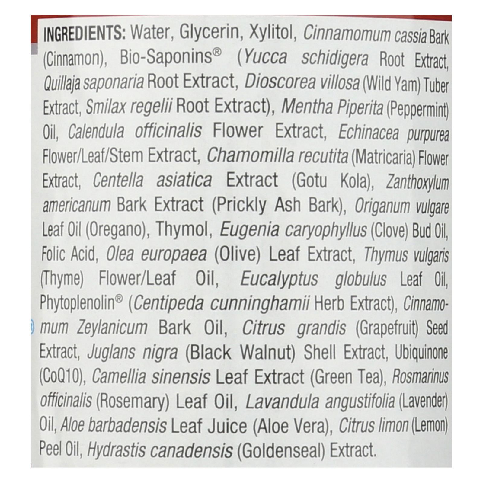 ingredients : water;glycerin;xylitol;cinnamomum cassia bark;cinnamon;bio-saponins®;yucca schidigera root extract;quillaja saponaria root extract;dioscorea villosa;wild yam;tuber extract;smilax regelii root extract;mentha piperita;peppermint;oil;calendula officinalis flower extract;echinacea purpurea flower/leaf/stem extract;chamomilia recutita;matricaria;flower extract;centella asiatica extract;gotu kola;zanthoxylum americanum bark extract;prickly ash bark;origanum vulgare leaf oil;oregano;thymol;eugenia cary