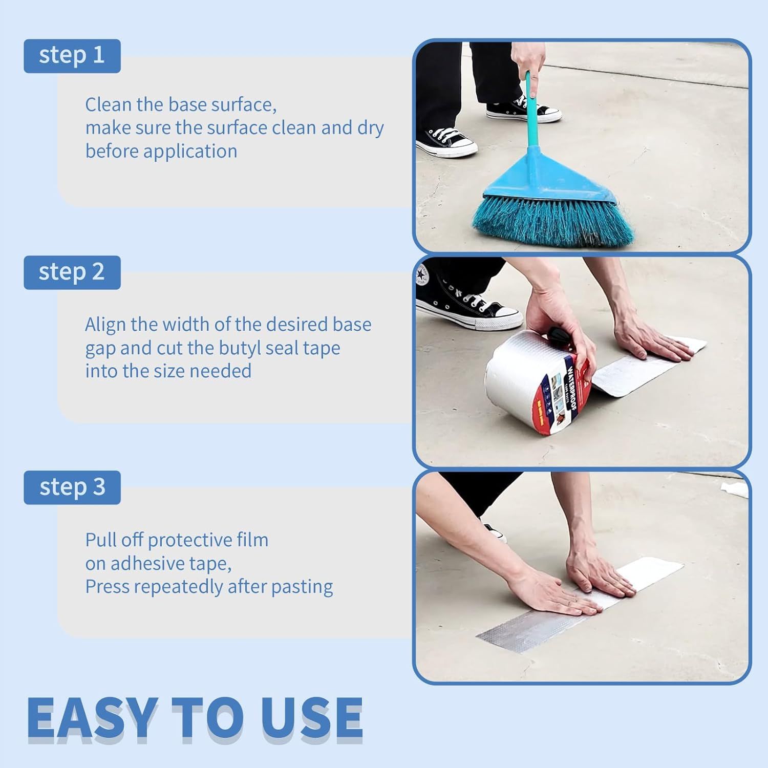 [EASY TO USE]Before you ues, make sure the construction surface is dry, clean and no impurities. Peel off the released film and then apply this butyl sealant tape to the surface.