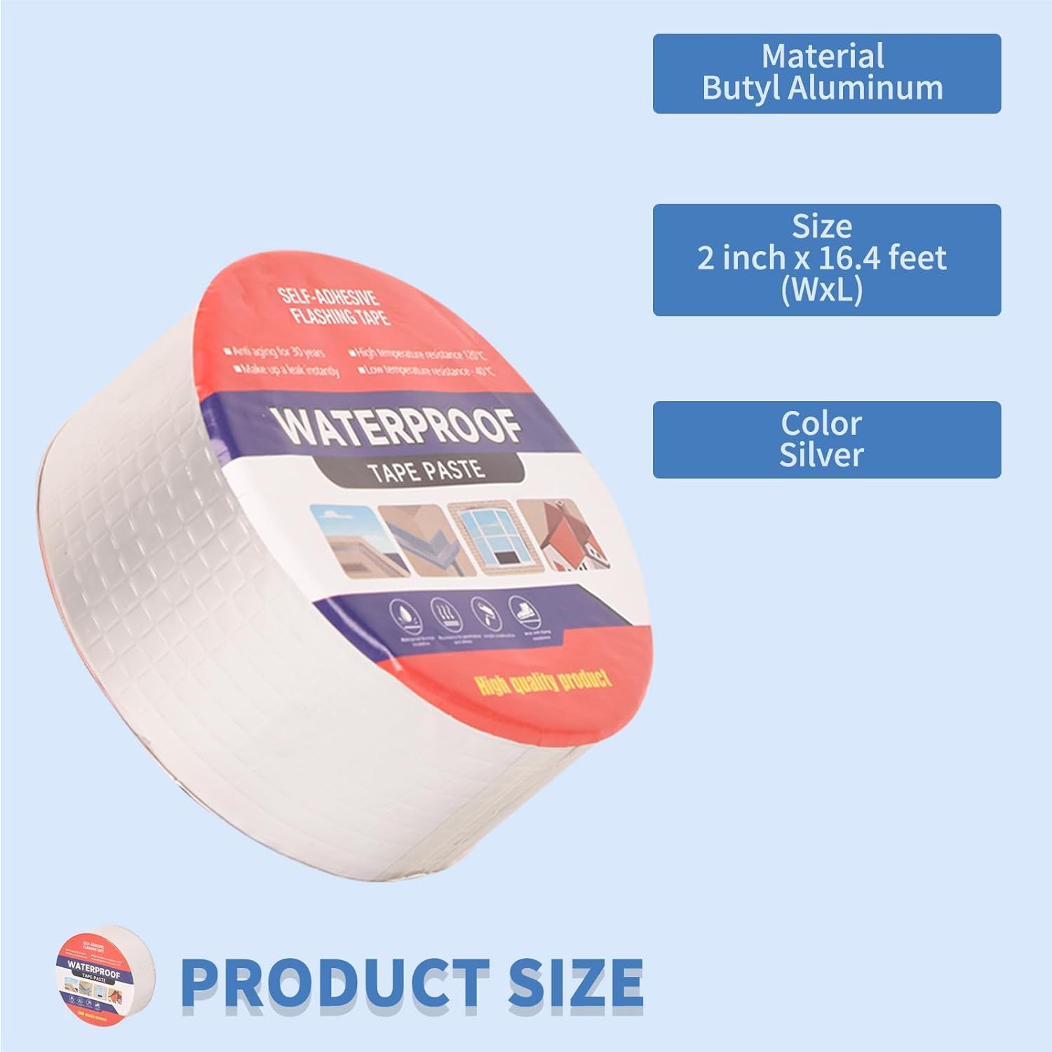 [SAFE & DURABLE]This super waterproof butyl seal duct tape is made of aluminum foil and butyl rubber. Butyl rubber is environmentally friendly material, and has a high viscosity. The small, square aluminum foil structure on the surface is abrasion-resistant and scratch-resistant. It also has a reflective and heat insulating effect. Don't have to worry about damage to the surface of the object from high temperatures.