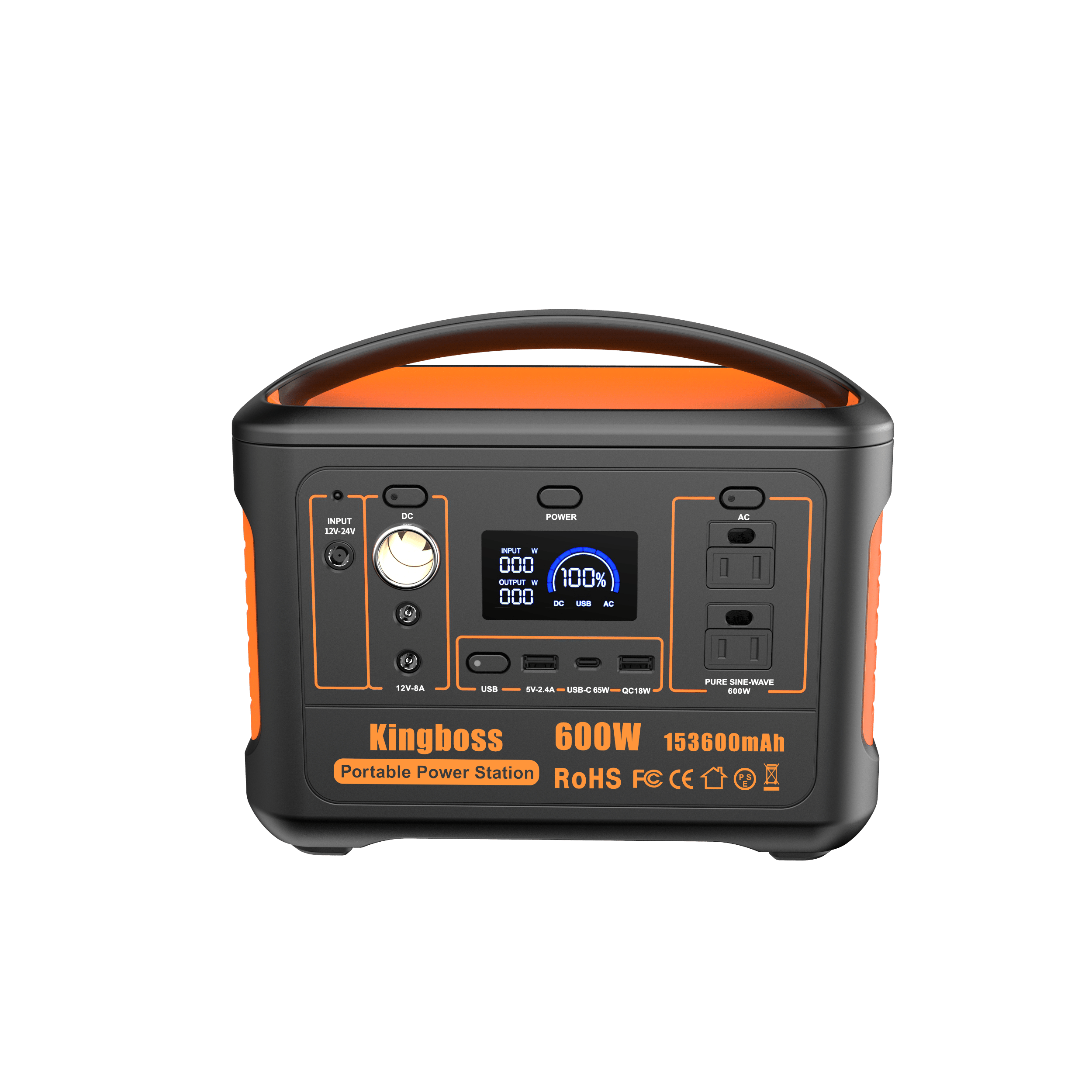 [MULTIPLE OUTPUT PORTS]: Kingboss Portable Power Station is featured with AC/DC/USB outputs: 2*110V AC output (600W); QC 3.0 USB port; 1*USB port (5V-2.4A); 1*USB-C PD65W; 1*DC input with 1*DC input (12V- 24V).[DEVICES]: Our Portable Power Station can charge devices such as: Computer; Jump Starter; Mini Projector; Fan; Mini Fridge; Printer; Drone; Phones/Tablet; Powertool; Laptop/TV. Only Devices up to 600W can be charged.[INCLUDES]: Kingboss Electric Generator includes 600W outdoor and indoor power supply; Car charger; AC power adapter; USB-C Cable + Kingboss Travel Carrying Case. Our 600W Power Station is perfect to be transported due to its weight (11Ibs) and size (7.70x5.20x9.10in).[RECHARGING METHODS]: Our Battery Powered Outlet can be recharged: With a compatible 100W solar photovoltaic panel (8 hours); With our car charger (12 hours); With AC Wall Outlet (6.5 hours). Lithium Battery 1000W recharges faster than other batteries.[PROTECTION]: Kingboss Battery Generator is equipped with an advanced BMS (Battery Management System) Multiple Outlet that protects the battery and devices against short circuits; over-temperature; overcharging; overvoltage and overpowering.[SAFETY]: Our power bank includes a Pure Sine Wave AC output that ensures stable and safer charging; and reduces audible and electrical noise. On top of that; it contains an MPPT controller built-in for optimized high-efficiency solar charging.[RELIABLE]: To give customers a pleasant experience; Kingboss offers a 2 Year Warranty that allows you to return the portable generator by 7 days in case it is defective; and a 24/7 customer service. Camping outdoor awaits you with our Solar Generator!