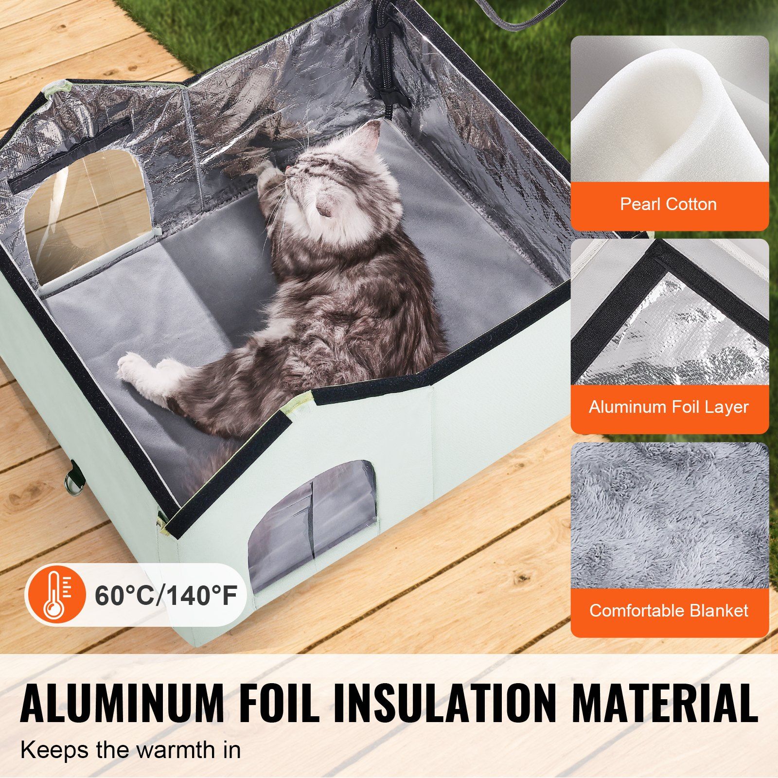 The built-in heating pad and soft blanket keep your cat's body temperature just right. The 6-sided aluminum foil and pearl cotton insulation significantly reduce heat loss, creating a warm winter haven.