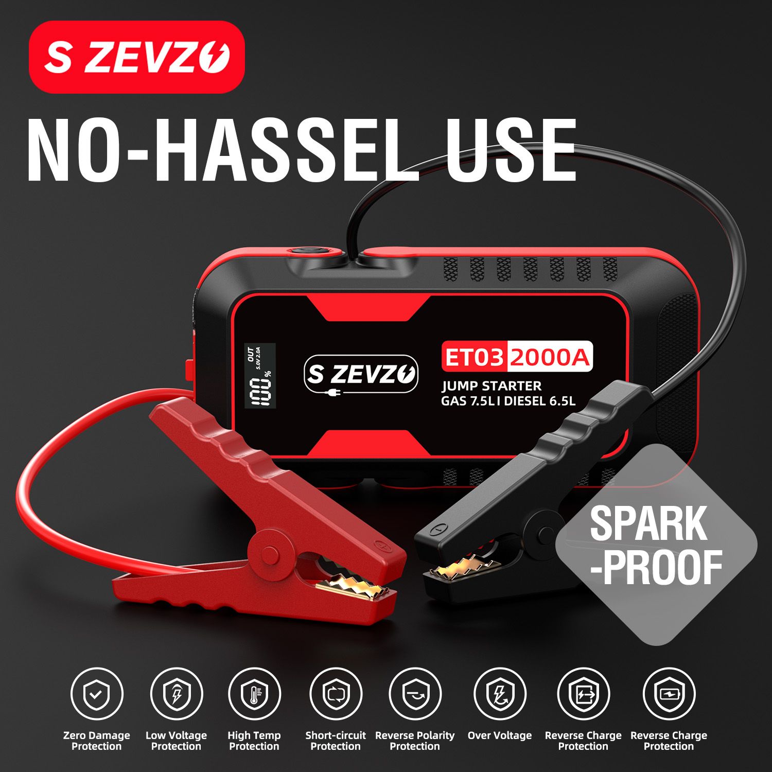 1.The car jump starter is a high-performance device capable of quickly jump-starting a wide range of 12V vehicles, including those with engines up to 7.5L gas or 6.5L diesel. With a peak current of 2500 amps, it can perform up to 40 jump-starts on a single charge. It is ideal for use with various vehicles such as lawnmowers, motorcycles, cars, trucks, and boats.