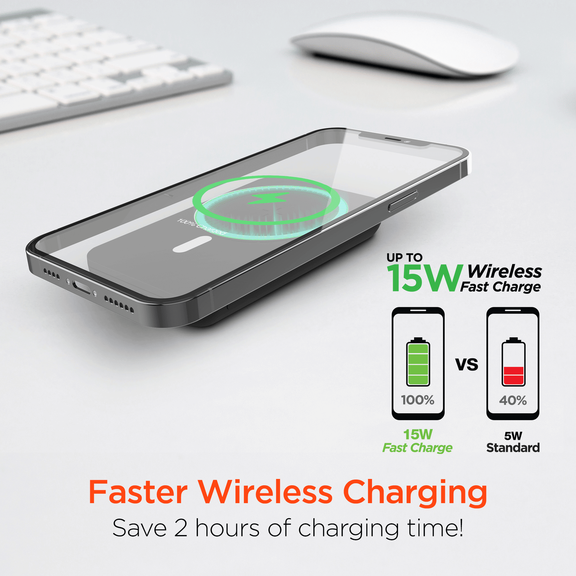 Never let a low battery slow you down while you're on the move! Simply snap the Magnetic Wireless Power Bank to the back of your iPhone 14 or MagSafe-compatible case for instant power. Designed with precise magnetic alignment, it stays securely in place, eliminating the need for constant readjustments while charging. Enjoy up to 15W of wireless fast charging—three times the power of standard chargers—and keep your devices topped up quickly. Need more power? Use the dual outputs: 20W USB-C Power Delivery and 18W Fast Charge USB for additional devices. Its ultra-slim, lightweight design ensures a seamless fit that won’t block your camera or add unnecessary bulk. Plus, the built-in 360° ring holder kickstand adds a secure grip and doubles as a stand for hands-free streaming, scrolling, or creating content on the go. Snap it on, power up, and stay connected!