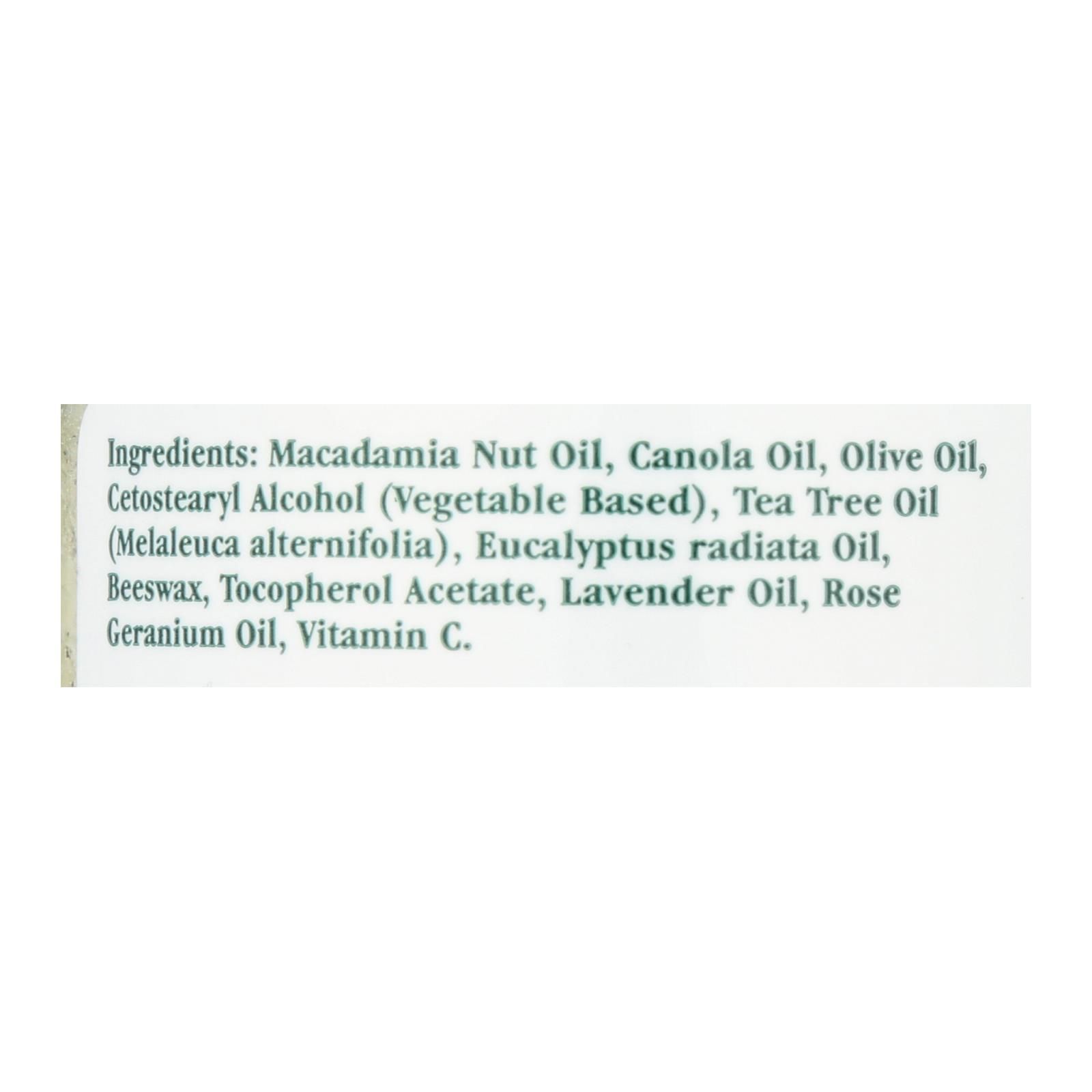 ingredients : macadamia nut oil;canola oil;olive oil;cetostearyl alcohol;vegetable based;tea tree oil;melaleuca alternifolia;eucalyptus radiata oil;beeswax;tocopherol acetate;lavender oil;rose geranium oil;vitamin c
