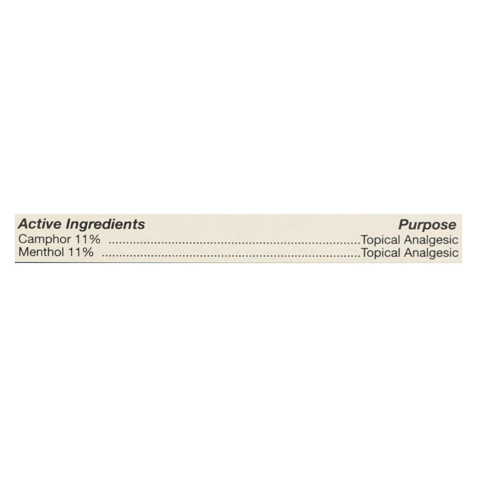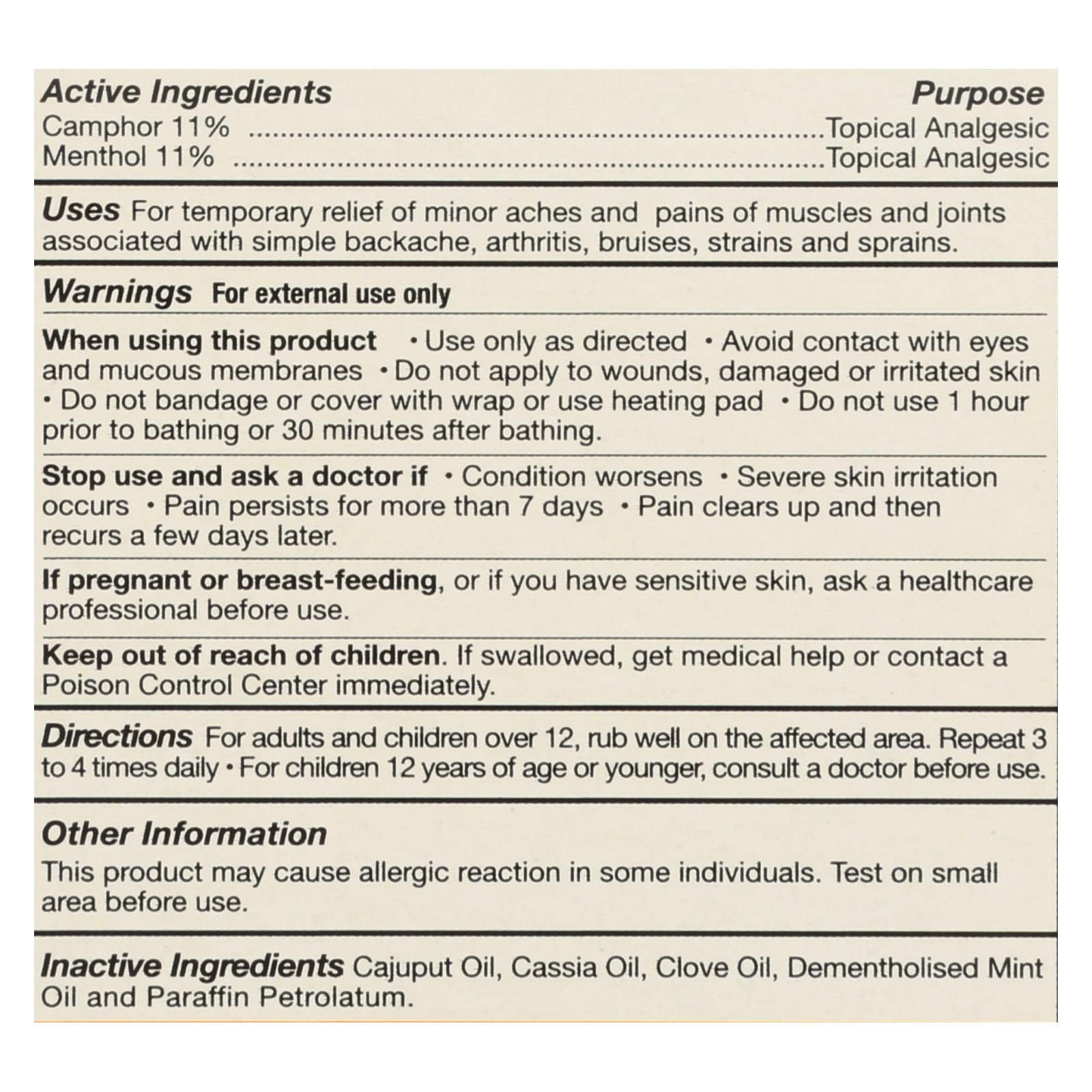ingredients : drug facts active camphor 11% purpose topical analgesic menthol 11% purpose topical analgesic;inactive cajuput oil;cassia oil;clove oil;dementholised mint oil and paraffin petrolatum